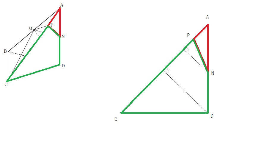 底面の四角形CDNPが含まれる△ACDを抜き出しました。分割するより△APNを引く方が良さそうですね。