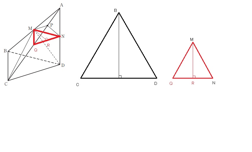 MからQNに垂線を下ろして交点をRとします。このMRが立体M-CDNPの高さになります。正三角形の高さを求めるのは省略してMR=2√3cm