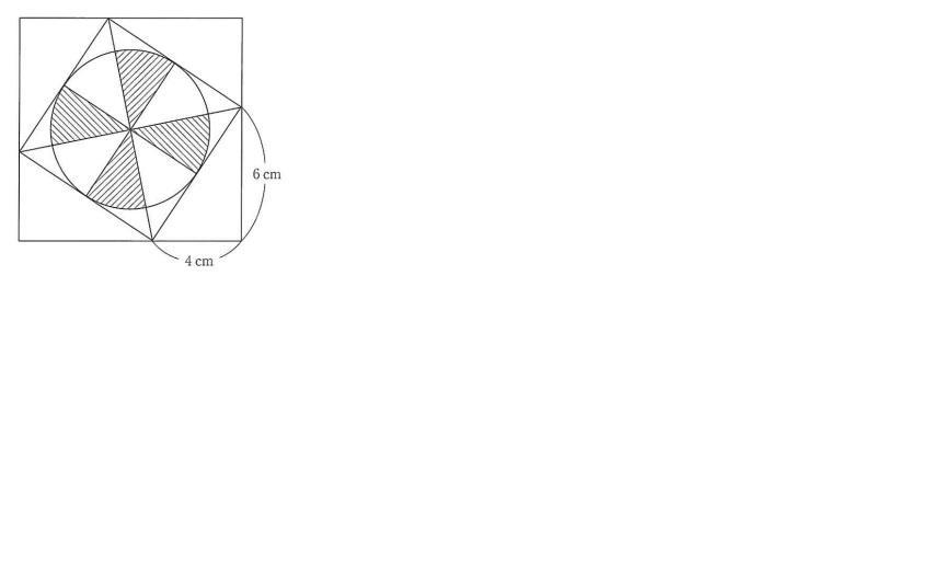 【問題】図は、2つの正方形と円でできた図形で、内側の正方形の頂点は外側の正方形の辺上にあります。斜線部分の面積を求めなさい。